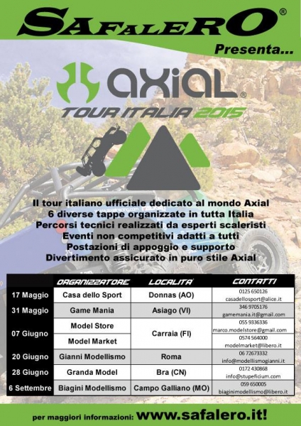 Safalero è lieta di presentare il primo AXIAL TOUR ITALIA ufficiale! Un tour di 6 tappe in giro per l'Italia dedicato al mondo di Axial e allo stile di vita legato agli scaler. 6 eventi ben distinti organizzati con il supporto di alcuni negozi specializzati vi regaleranno una full immersion nel mondo degli scaler grazie a percorsi creati da esperti scaleristi e ad una logistica perfetta per divertisi all'aperto con il vostro scaler AXIAL.